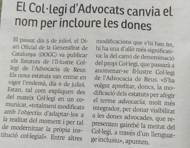 Els nous Estatuts entraran en vigor demà, dia 6 de juliol de 2019. Estan totalment modificats amb l’objectiu d’adaptar-los a la realitat del moment i per tal de modernitzar la pròpia institució col·legial. Entre altres modificacions, hi ha una d’allò més significativa: la del canvi de denominació del propi Col·legi, que passarà a anomenar-se Il·lustre Col·legi de l’Advocacia de Reus. S’ha volgut aprofitar, doncs, la modificació d’aquests Estatuts per afegir el terme ‘advocacia’, molt més integrador, per donar visibilitat a les dones advocades, que representen gairebé la meitat del Col·legi, a través d’un llenguatge inclusiu.