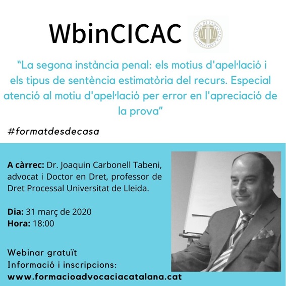 La segona instància penal: els motius d’apel·lació i els tipus de sentència estimatòria del recurs. Especial atenció al motiu d’apel·lació per error en l’apreciació de la prova, a càrrec del Dr. Joaquim Carbonell