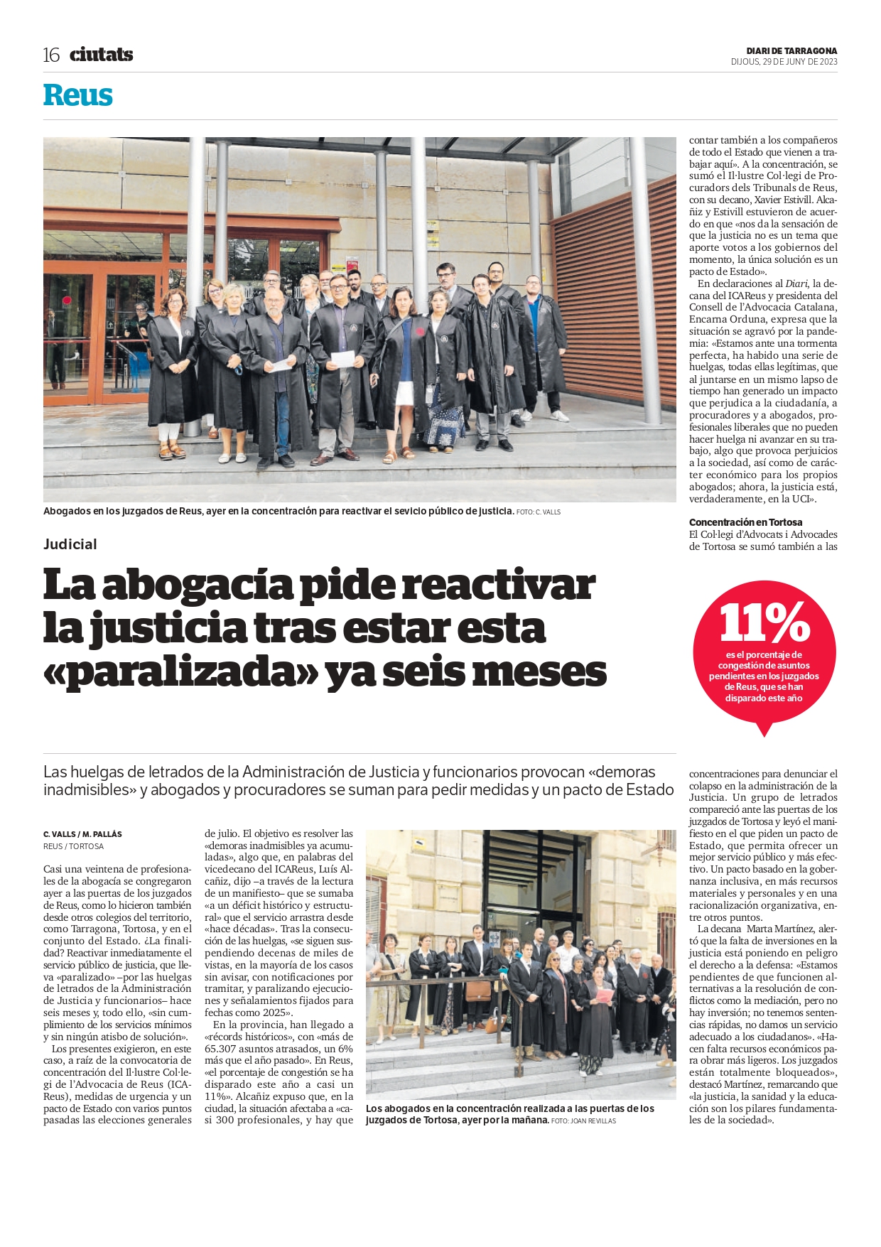 Aquest dimecres 28 de juny ha tingut lloc davant de la seu judicial la concentració convocada pel Col·legi de l’Advocacia de Reus per tal de reclamar que es reactivi la Justícia després de mesos de vaga dels lletrats i lletrades de l’Administració de Justícia i dels funcionaris, així com, buscar una solució a aquesta situació insostenible que vivim com a professionals.