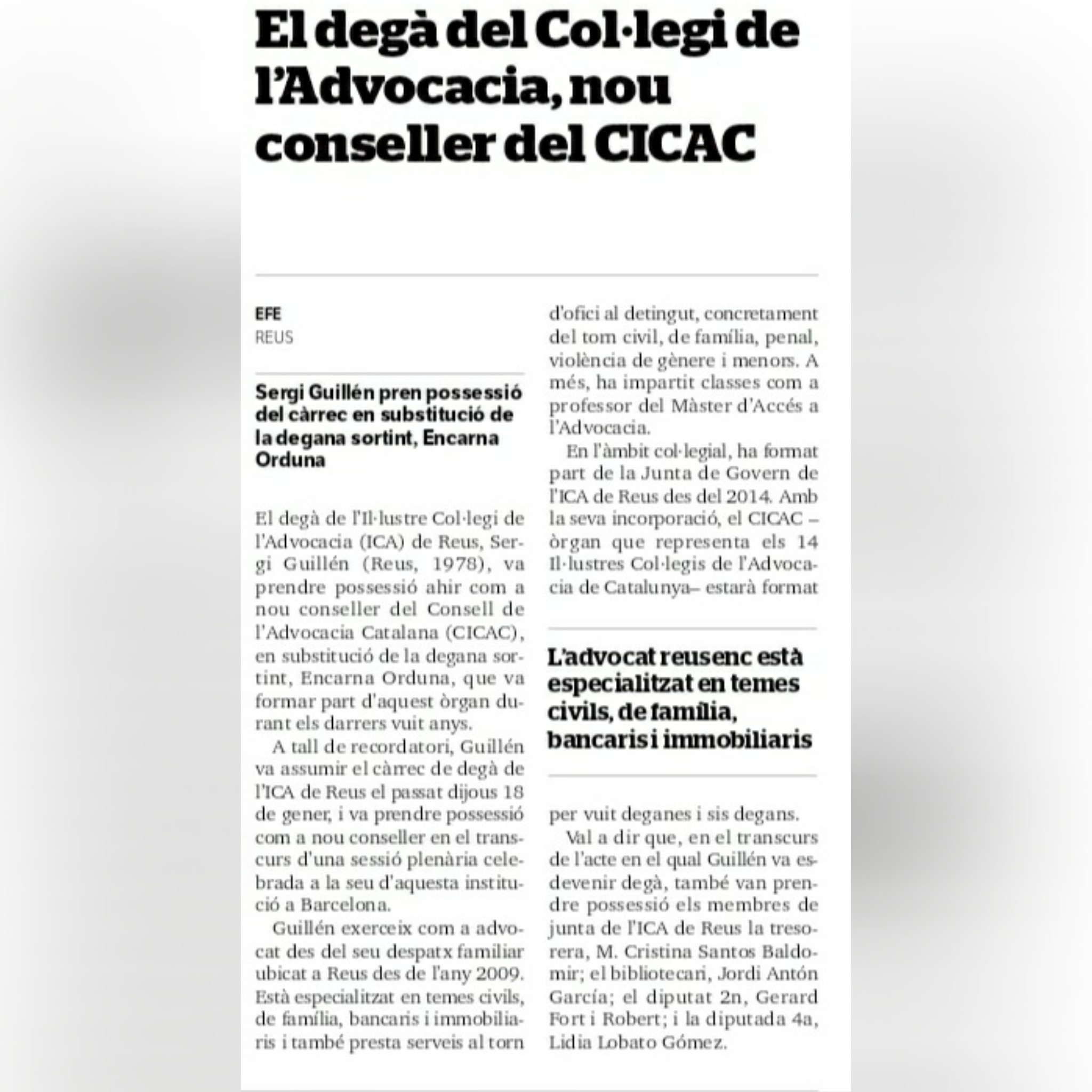 El nou degà del Col·legi de l’Advocacia de Reus, Sergi Guillén, ha pres possessió aquest dilluns 22 de gener de 2024 com a nou conseller del Consell de l’Advocacia Catalana. Guillén relleva en el càrrec a la degana sortint, Encarna Orduna, que ha format part durant els darrers vuit anys del Consell representatiu dels catorze Col·legis de l’Advocacia de Catalunya.