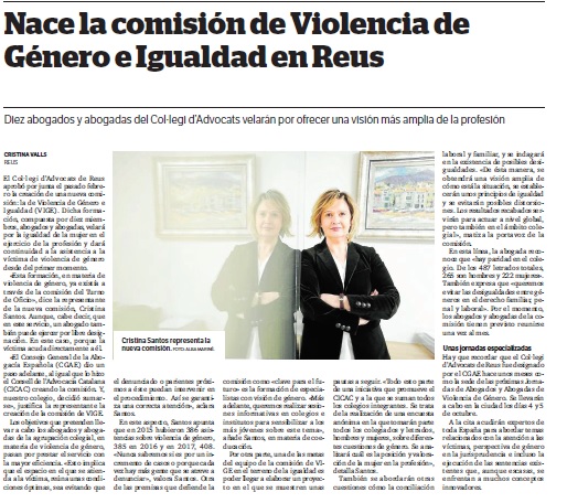 Us comuniquem que recentment es va crear la comissió de Violència de Gènere i Igualtat al Col·legi d'Advocats de Reus. Us deixem aquí la notícia que ha dut a terme el Diari de Tarragona, en la seva secció dedicada al Dia Internacional de la Dona 2018.