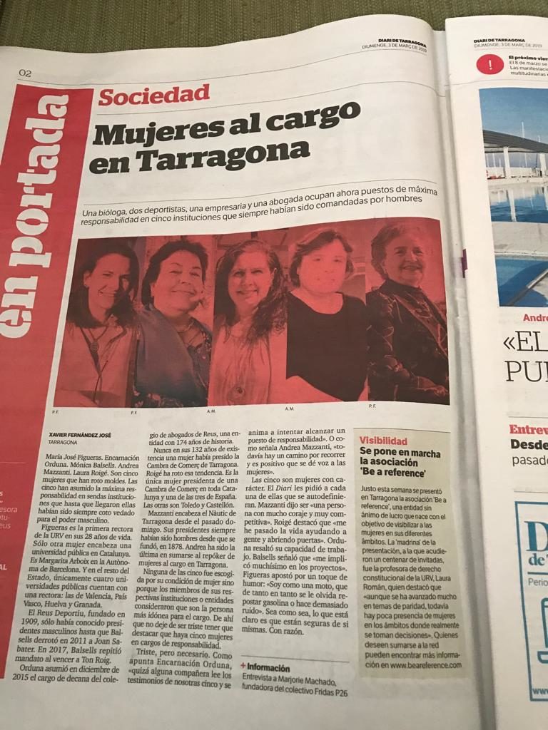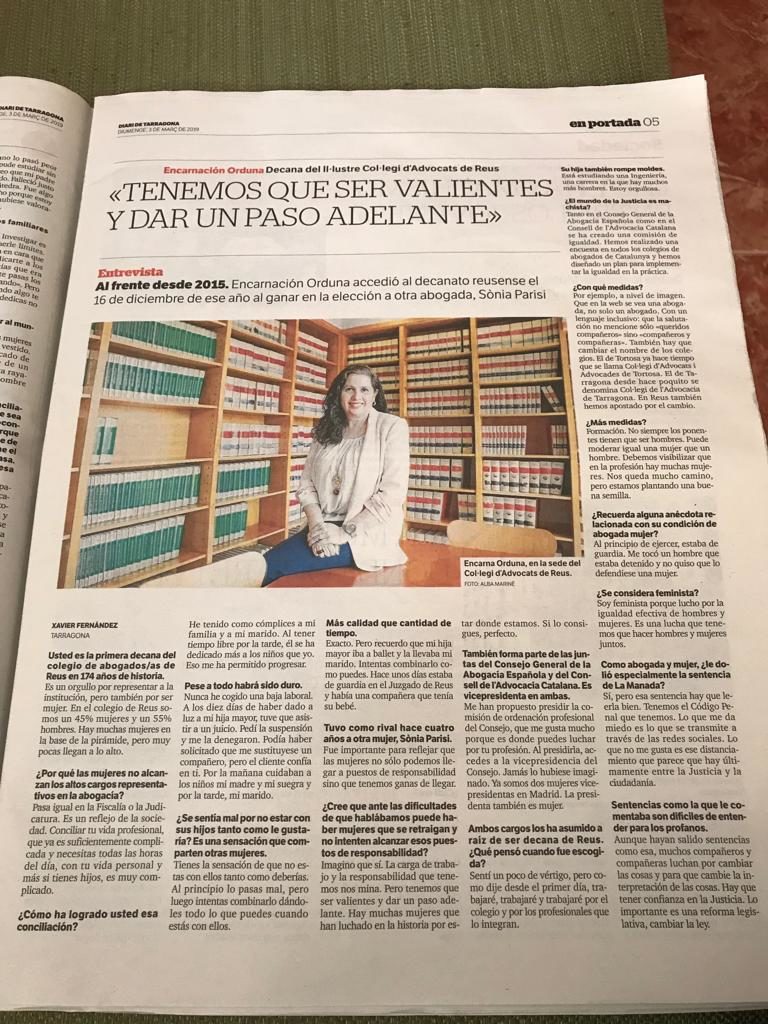 Aquest diumenge parlen de la degana del Col·legi d'Advocats de Reus, Encarna Orduna, entre altres dones al Diari de Tarragona amb motiu de l'apropament del Dia Internacional de la Dona, divendres 8 de març.