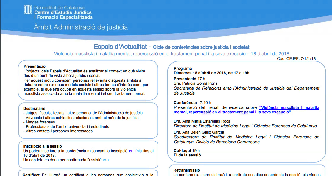 Us informem que el proper dia 18 d’abril, a la sala d’actes del CEJFE de 17 a 19 h, tindrà lloc la presentació de la recerca: Violència masclista i malaltia mental, repercussió en el tractament penal i la seva execució.
