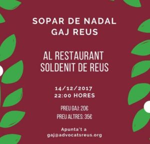 Teniu fins al dia 6 de desembre per confirmar la vostra assistència i comunicar-nos l’elecció del segon plat al correu gaj@advocatsreus.cat.