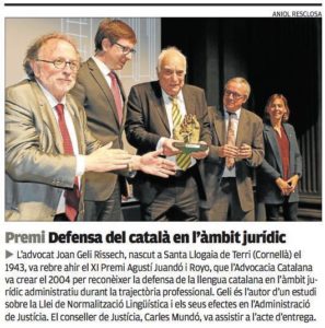 Us informem què va passar la setmana del 17 al 22 d'abril. Les activitats van començar dimecres 19 d'abril quan es va dur a terme l'assistència del CRAJ al Consejo General de la Abogacía Española (CGAE). L'endemà dijous es va assistir al Ple del CGAE i, al mateix dia el Col·legi va fer acte de presència a Girona a l'entrada del Premi Agusti Juandó  (imatge superior) que otorga la Comissió de la Llengua del CICAC. Per últim, el 21 d'abril els responsables del Torn d'Ofici van reunir-se a la comissió del TOAD del CICAC.