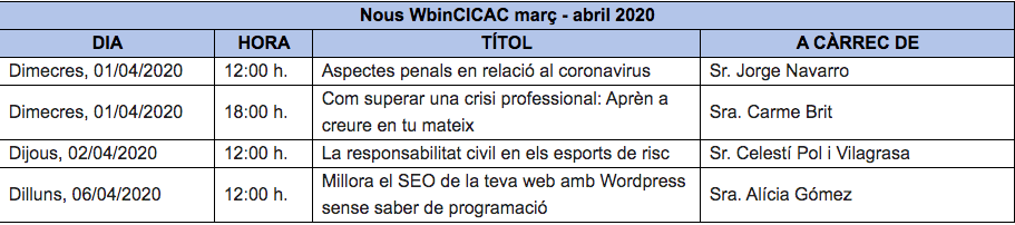 Adjunt us fem a mans quatre imatges més dels WbinCICAC que tindran lloc durant aquests dies de confinament i que són: