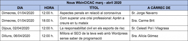 Aquest és el resum de la informació en relació a les accions formatives que ens han comunicat avui. Adjunt us fem a mans quatre imatges més dels WbinCICAC que tindran lloc durant aquests dies de confinament i que són: