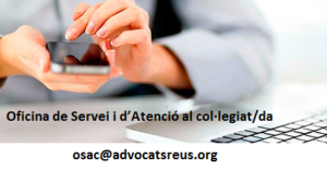 Amb l'objectiu que la comunicació encara més fluïda entre el Col·legi i els/les col·legiat/des, està activa l’Oficina de Servei i d’Atenció al col·legiat/da (OSAC). La seva funció és promoure la vostra participació en la vida i el funcionament col·legial i millorar els serveis als col·legiats. Tots els/les col·legiats/des podreu fer arribar els vostres suggeriments, propostes, i queixes que considereu oportunes en relació la millora dels serveis col·legials al següent mail: osac@advocatsreus.org.