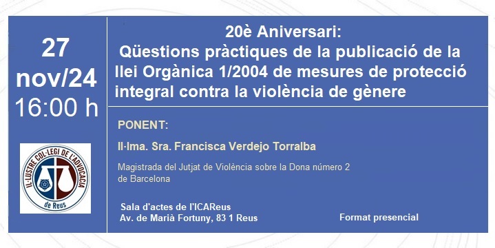 La Comissió d’Igualtat i Violència Masclista del Col·legi de l’Advocacia de Reus, amb motiu de la celebració del 25N, Dia Internacional per l’Erradicació de la Violència vers les Dones, ha organitzat una conferència amb el títol: “20 è Aniversari: Qüestions pràctiques de la publicació de la llei Orgànica 1/2004 de mesures de protecció integral contra la violència de gènere” que anirà a càrrec de l’Il·lma. Sra. Francisca Verdejo Torralba, magistrada del Jutjat de Violència sobre la Dona número 2 de Barcelona.