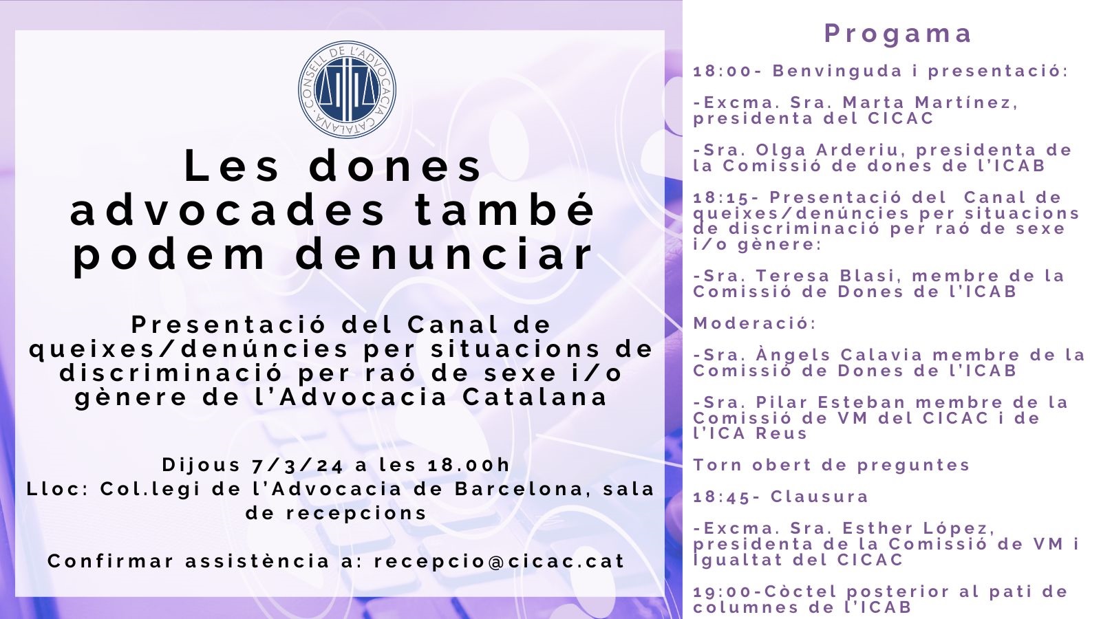 Per commemorar el dia Internacional de les Dones la Comissió de Violència i Igualtat del Consell de l’Advocacia Catalana, presidida per la Degana de l’ICASF, l’Excma. Sra. Esther López,  ha organitzat conjuntament amb la Comissió de Dones de l’Il·lustre Col·legi de l’Advocacia Barcelona, un acte  per a la presentació del Canal de queixes/denúncies per situacions de discriminació per raó de sexe i/o gènere, que el Consell de l’Advocacia Catalana posa a disposició de les persones col·legiades.