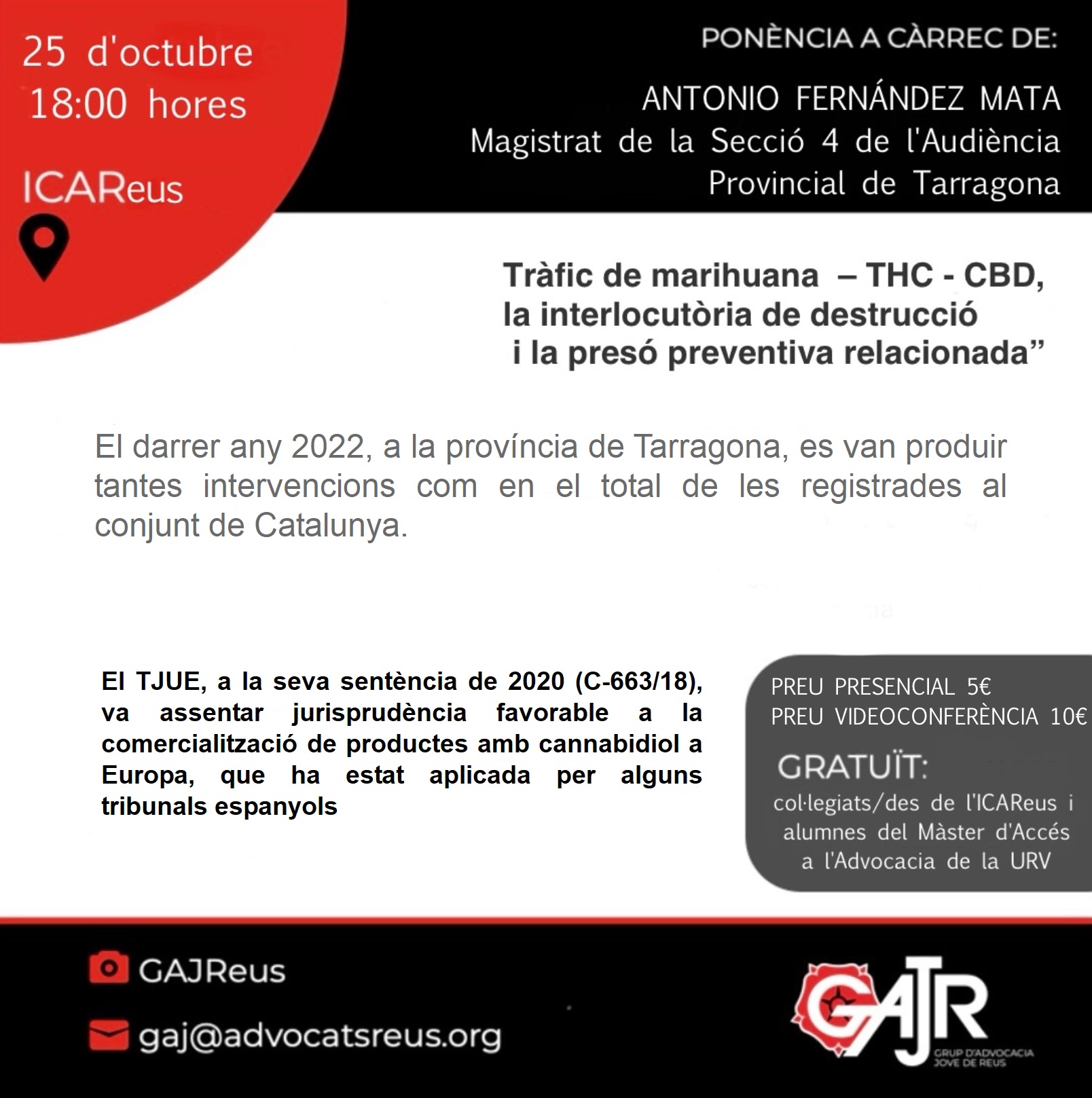 Us informem que el Grup de l’Advocacia Jove de Reus, juntament amb la col·laboració de l’Escola de Pràctica Jurídica Guillem Maria de Brocà, ha organitzat una formació que, sota el títol “Tràfic de marihuana – THC - CBD, la interlocutòria de destrucció i la presó preventiva relacionada”, es celebrarà el 25 d’octubre a les 18:00 hores a la seu de l’Il·lustre Col·legi de l’Advocacia de Reus.
