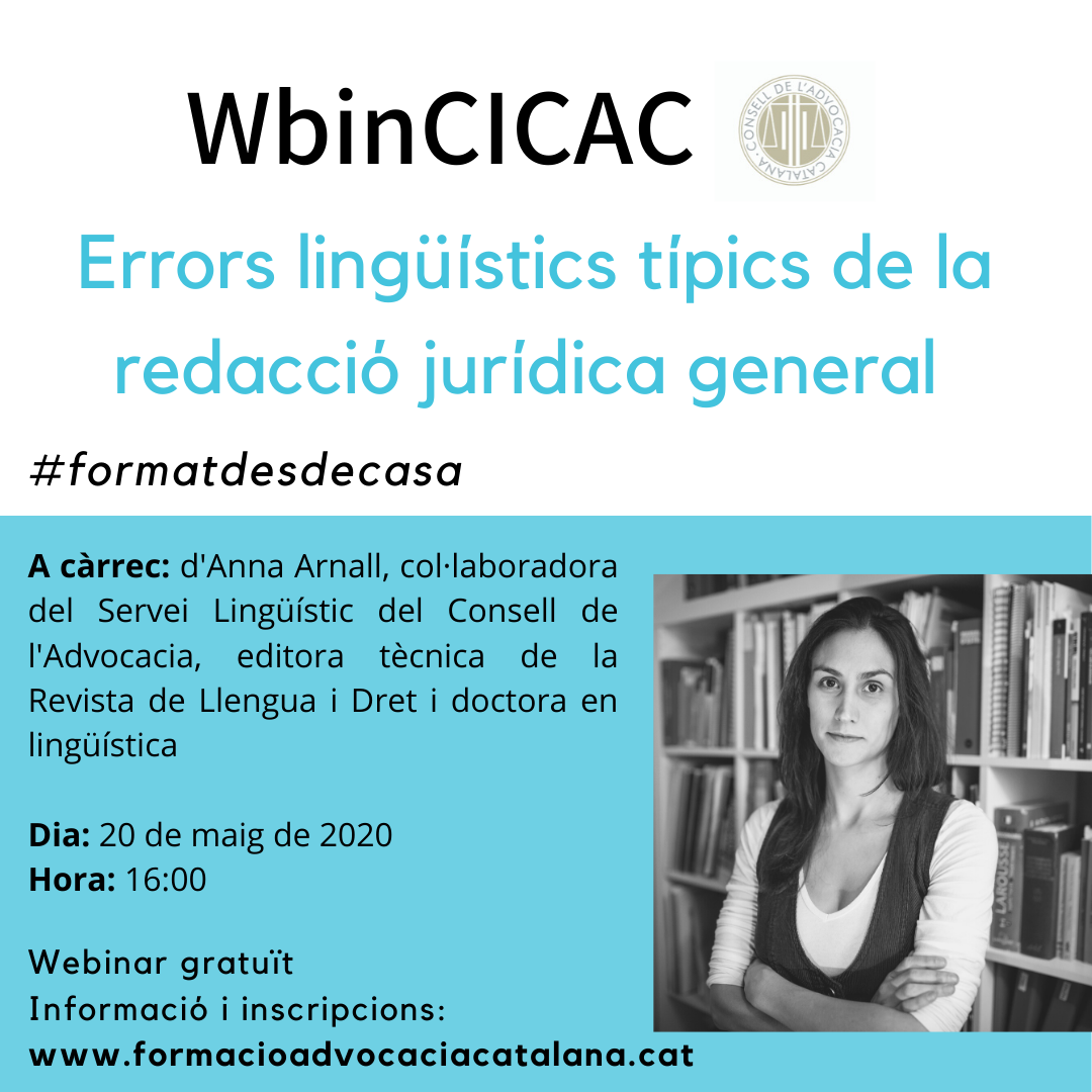 Errors lingüístics típics de la redacció jurídica general, a càrrec de la Sra. Anna Arnall. Col·laboradora del Servei Lingüístic del Consell de l’Advocacia, editora tècnica de la Revista de Llengua i Dret i doctora en lingüística.