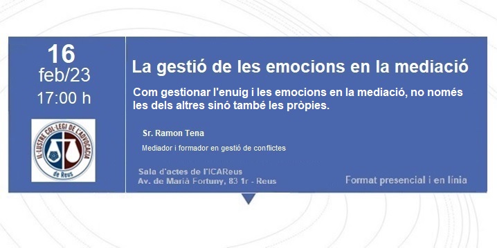 El Sr. Ramon Tena Pera mediador i formador en gestió de conflictes, realitza una formació de títol La Gestió de les Emocions en la Mediació, a la Sala d’Actes del Il·lustre Col·legi de la Advocacia de Reus, organitzada per la Comissió de Mediació de l’ICAReus i l’Escola de Pràctica Jurídica Guillem M. de Brocà.